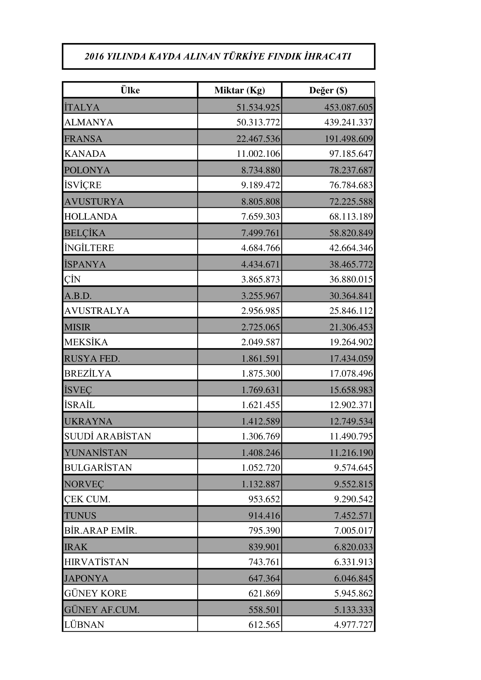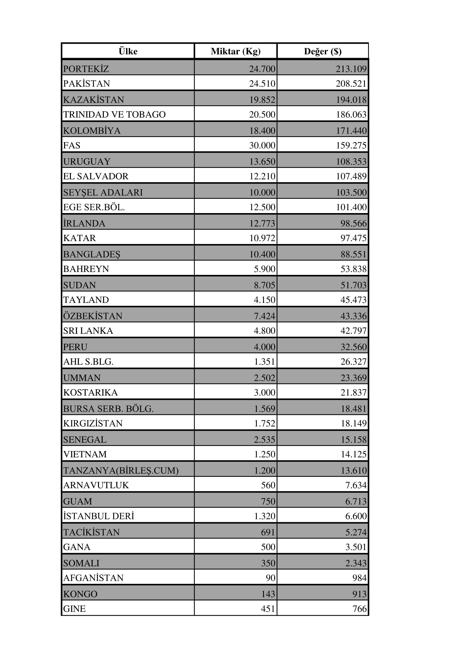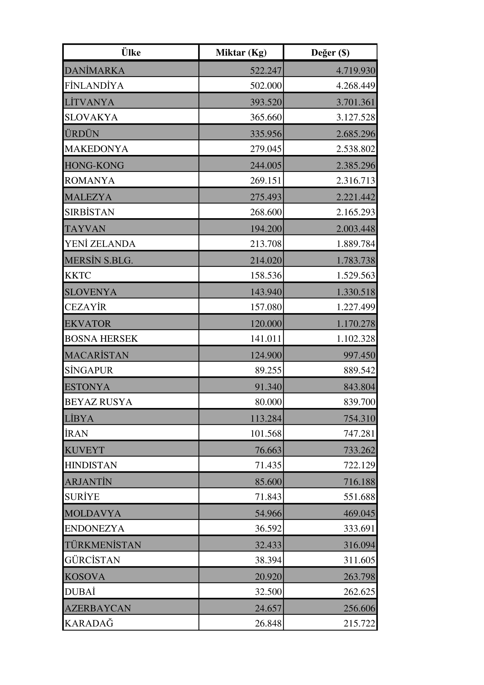 Tüm ihracat listesi şu şekildedir: